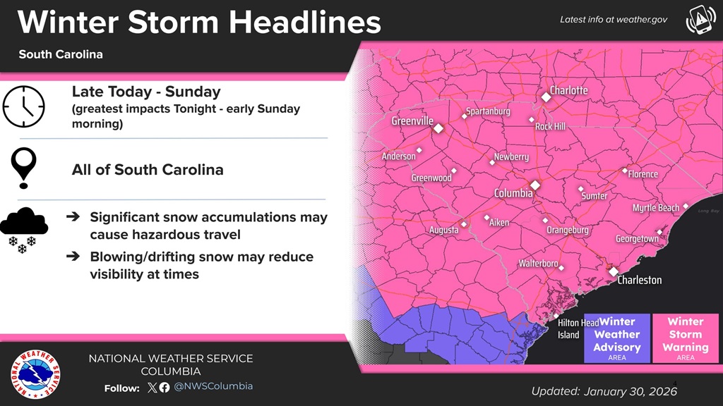 “South Carolina’s Emergency Response Team is prepared to respond quickly and efficiently to any impacts from this winter weather event,” said Kim Stenson, Director of SCEMD. “We encourage residents to stay informed, take precautions, and plan ahead for their safety.”