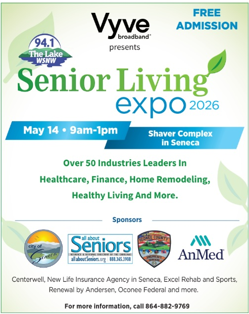 Make your plans to attend the 2026 Senior Living Expo on May 14th in Seneca, SC. This is a great chance to meet with over 50 industry leaders in healthcare, finance, home remodeling and so much more. For more information call 94.1 The Lake at 864-882-9769